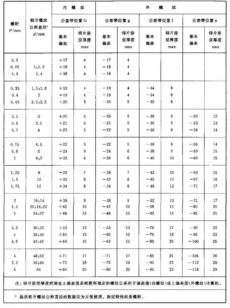 符合 G B/T 197,GB/T 9145和GB/T 2516的普通螺紋上涂鋅層的厚度與表1給出的基本偏差有關(guān),還與內(nèi)、外螺紋和下列公差帶位置有關(guān):