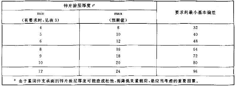 為達到規(guī)定的防腐性能(見第6章),若規(guī)定最小涂層厚度(,.t )時,對涂鋅層厚度范圍的規(guī)定應考慮到該尺寸與其最小涂層厚度基本相等。因此,估計的最大涂層厚度是所要求的最小涂層厚度的兩倍,見表2。對規(guī)定最小厚度為4t_(或8tm,})的涂層,所適用的螺紋最小基本偏差,也在表2中給出。